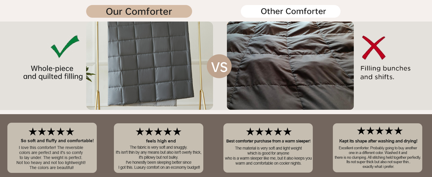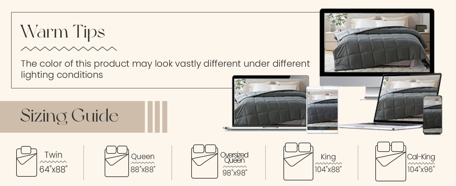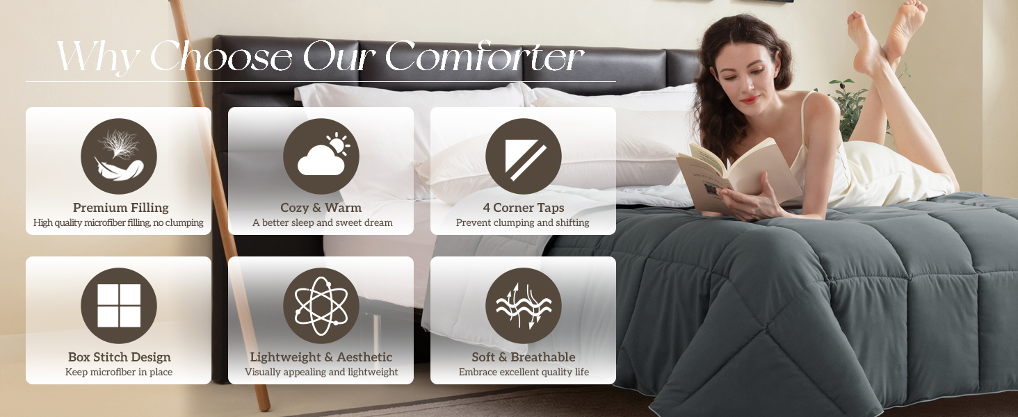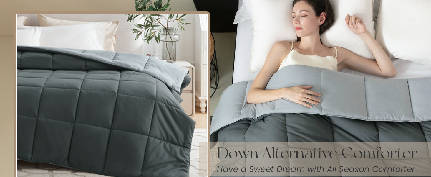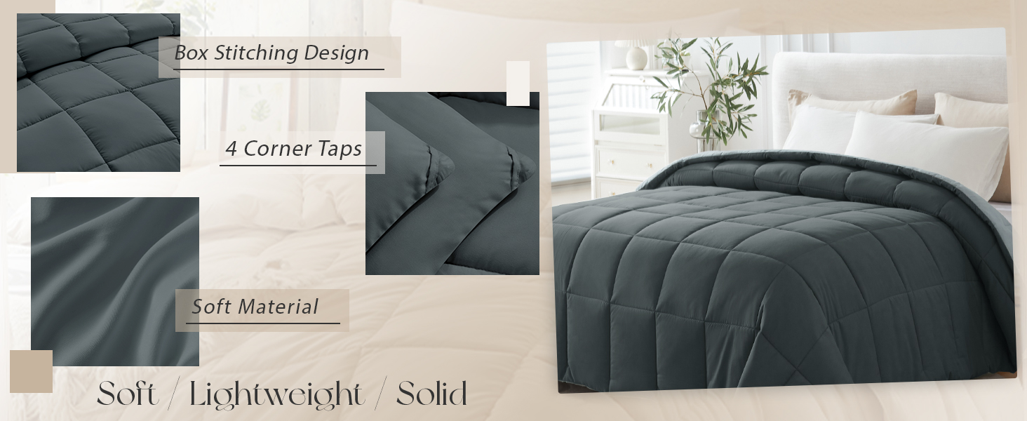 ONE COMFORTER, TWO MOOD. The reversible comforter twin size can be reversed depending on your bed sheets and your mood. There are more colors available, grey , navy, blue, brown, pink, beige, white, black, purple, lavender, teal and ivory. The summer comforter twin size with 4 corner tabs to anchor duvet cover, so the bed twin comforter can be used as down alternative duvet insert or as a stand alone blanket comforter